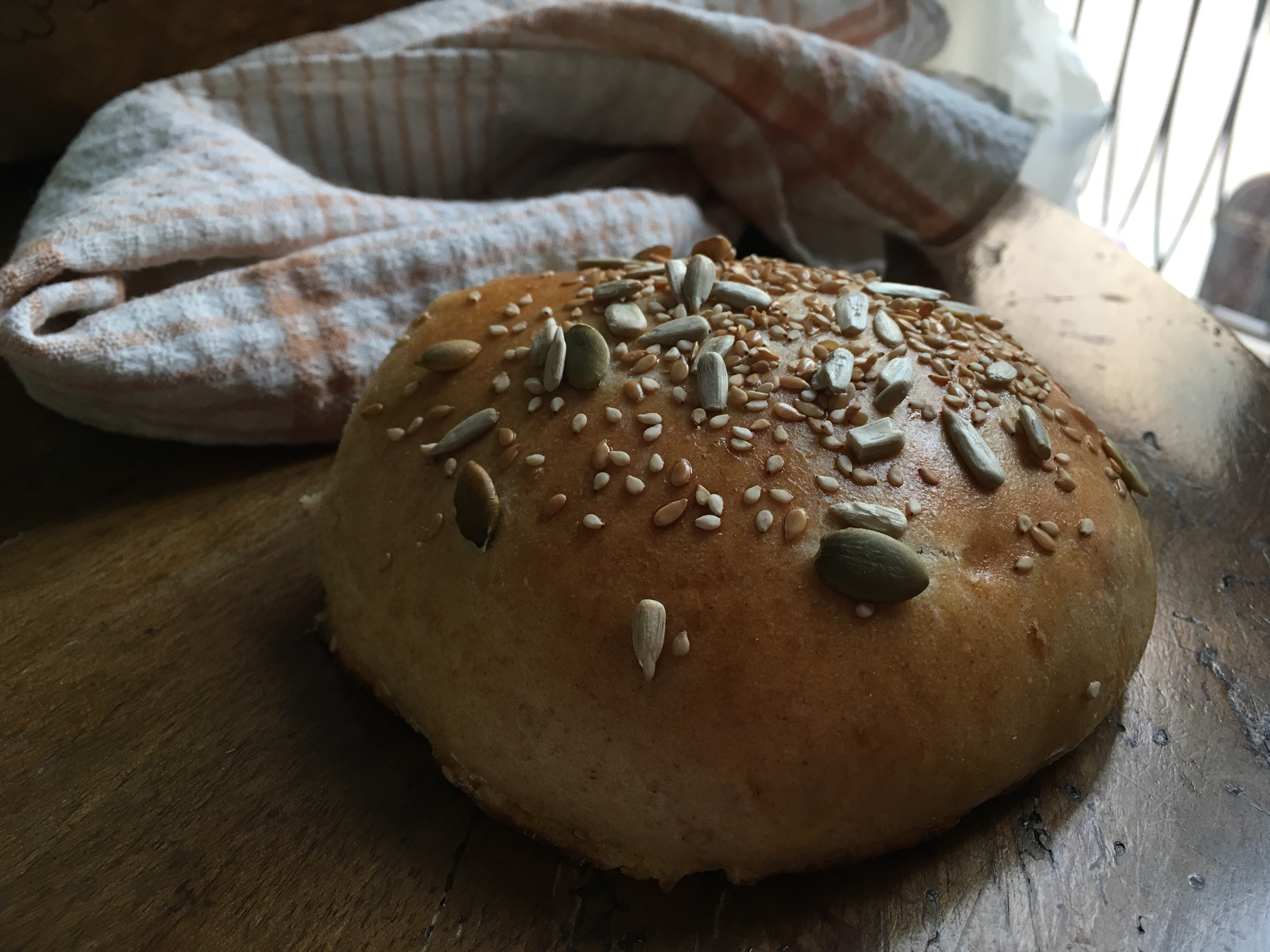 Mettiamo su una teglia e copriamoli nuovamente col canovaccio umido. Facciamo lievitare per un’altra ora. Quando saranno ben gonfi, spennelliamo la superficie con un composto di uovo e acqua (un cucchiaio d’acqua per un uovo) o con dell’olio, se preferite, e coprargiamo la superfice con semini (di sesamo, di lino, di papavero, di girasole).