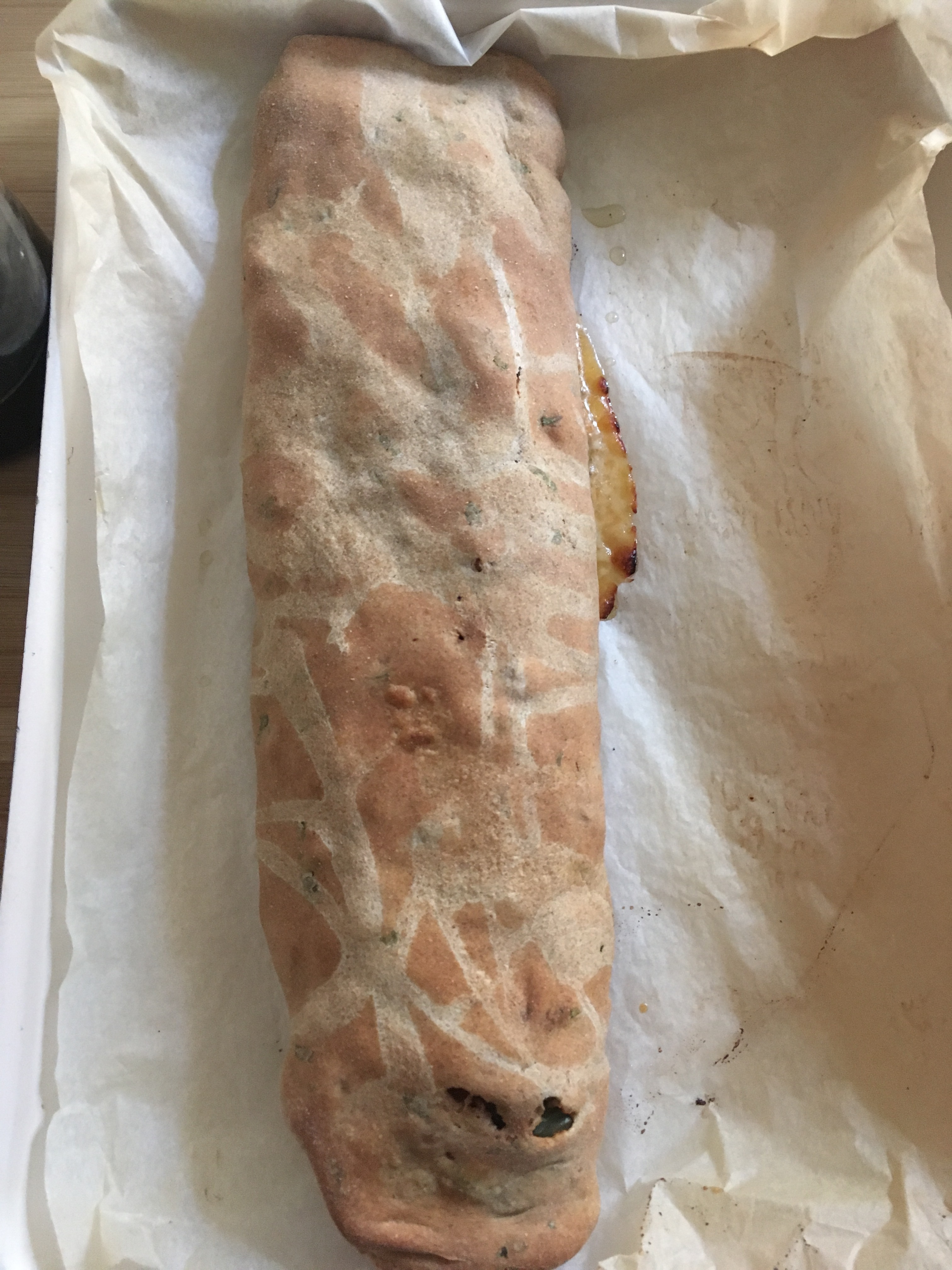 Aiutandoci con la carta da forno, trasferiamo lo strudel in una teglia, spennelliamolo con l’olio e inforniamo in forno a 190° per 20 minuti o comunque fino a perfetta doratura.