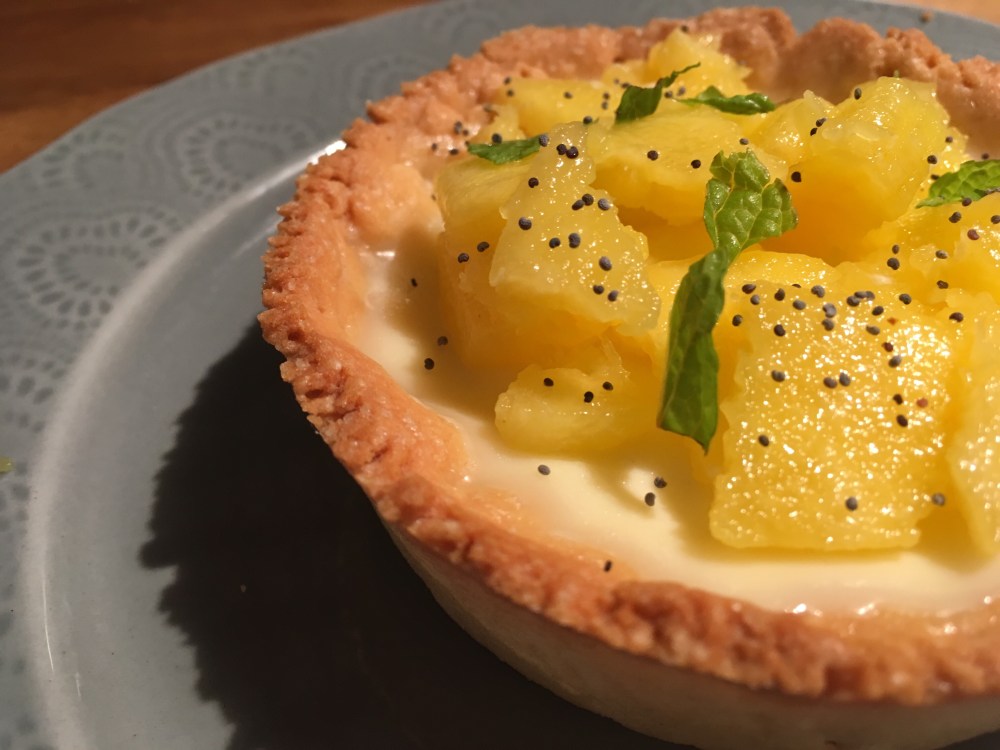 Guarniamo con il mango tagliato a dadini, qualche foglia di menta e una spolverata di semi di papavero.