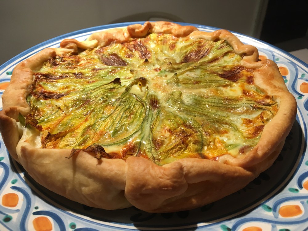 Stendiamo la pasta brisée nello stampo mantenendo i bordi della pasta fuori dallo stesso. Versiamo la farcia e decoriamo con i fiori di zucca interi. Inforniamo a 180° per circa 25/30 minuti. Sforniamo e serviamo tiepida.