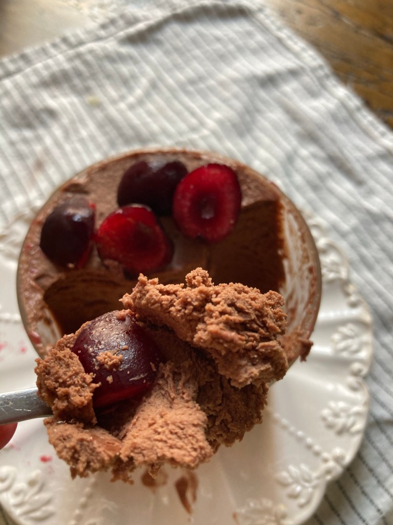 Prima di servire, guarnisco con delle ciliegie tagliate a pezzi.